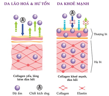 Collagen chiếm khoảng 70% cấu trúc da và được phân bổ chủ yếu ở lớp hạ bì của da. Collagen có tác dụng kết nối các tế bào, kích thích quá trình trao đổi chất, tạo độ đàn hồi của da. Sự suy giảm về chất lượng và số lượng collagen sẽ dẫn đến hậu quả “lão hoá” của cơ thể mà sự thay đổi trên làn da, trên khuôn mặt là dấu hiệu dễ nhận biết nhất: làn da bị khô, nhăn nheo bắt đầu từ các đường nhăn mảnh trên khoé mắt, khoé miệng, lâu dần thành nếp nhăn sâu, các đường nét khuôn mặt bị chùng nhão và chảy xệ. Chính vì vậy mà collagen đóng vai trò là một trong những chất quan trọng hàng đầu của ngành thẩm mỹ, đặc biệt là chăm sóc da, phẫu thuật thẩm mỹ, phẫu thuật bỏng…