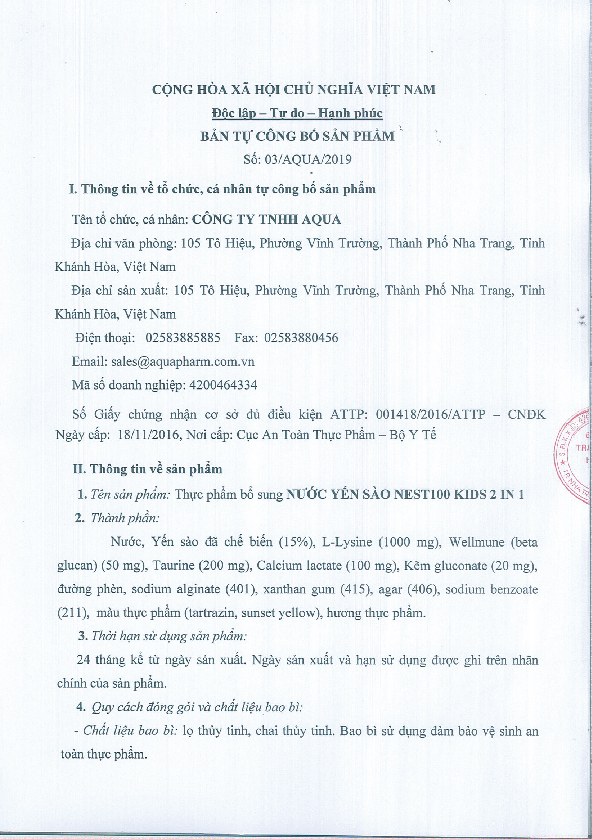 HỒ SƠ CÔNG BỐ SẢN PHẨM - thực phẩm bổ sung NƯỚC YẾN SÀO NEST100 KIDS 2IN1