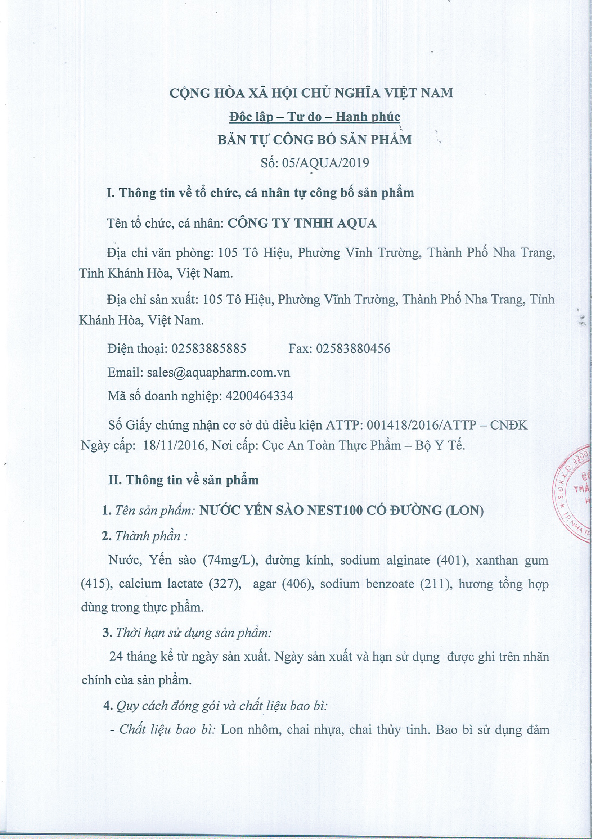HỒ SƠ CÔNG BỐ SẢN PHẨM - NƯỚC YẾN SÀO NEST100 CÓ ĐƯỜNG (lon)