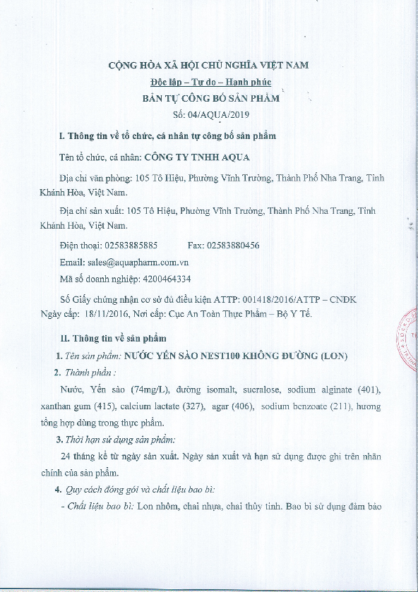 HỒ SƠ CÔNG BỐ SẢN PHẨM - NƯỚC YẾN SÀO NEST100 KHÔNG ĐƯỜNG (lon)