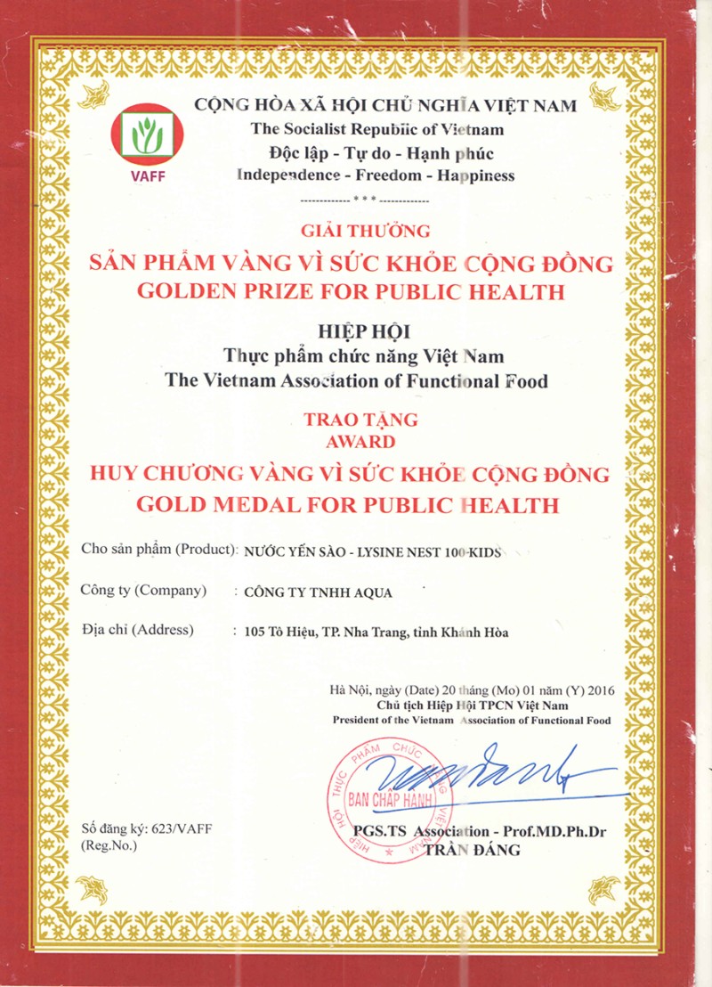 Bảng xác nhận Nước yến sào – Lysine – Nest 100 Kids đạt giải thưởng “sản phẩm vàng vì sức khỏe cộng đồng”