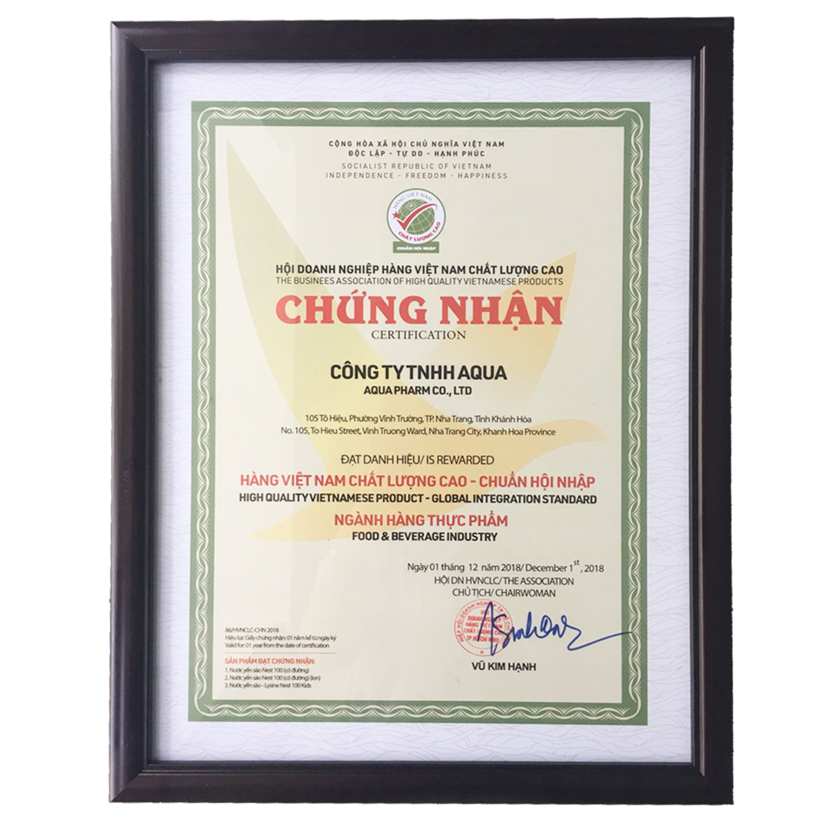 Aquapharm tự hào đạt danh hiệu: " Hàng Việt Nam chất lượng cao - Chuẩn hội nhập" Năm 2018