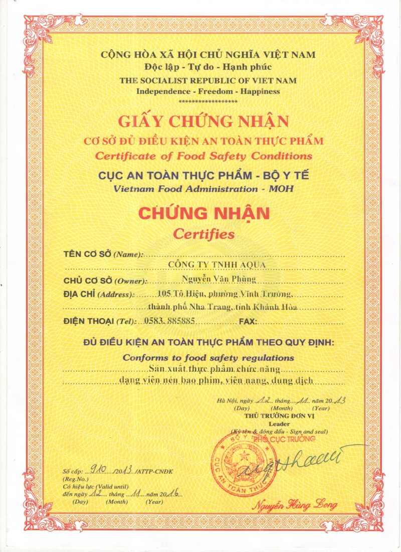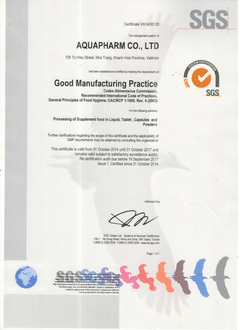 Chứng nhận iso_GMP_HSCCP là cam kết chất lượng mà Aquapharm mang đến với khách hàng. Bạn có thể hoàn toàn an tâm khi lựa chọn các sản phẩm yến sào Khánh Hòa. Chúng tôi luôn mong muốn mang đến cho khách hàng những sản phẩm chất lượng cao nhất, cùng với khả năng bảo vệ sức khỏe tuyệt vời.