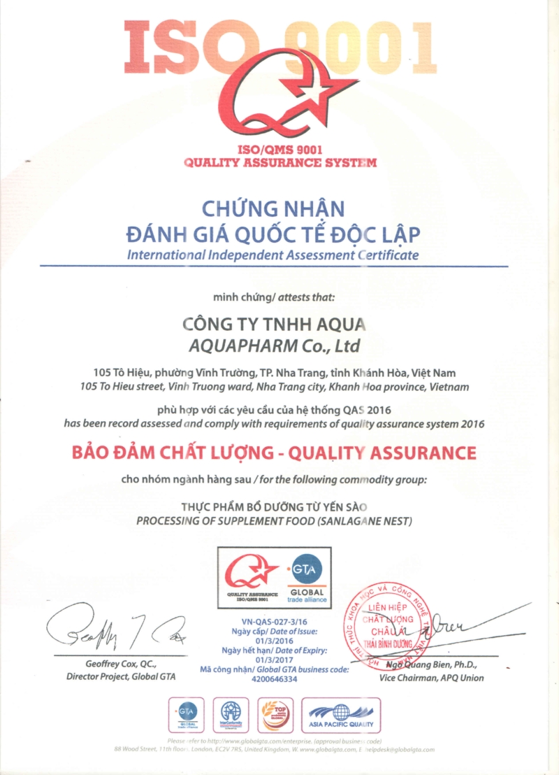 NƯỚC YẾN AQUAPHARM ĐẠT CHUẨN QAS 2016- ĐẢM BẢO CHẤT LƯỢNG (ISO/QMS 9001)