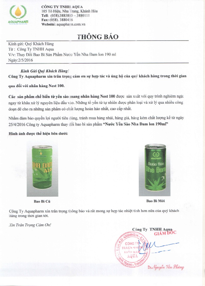 Nhằm đảm bảo quyền lợi người tiêu dùng,tránh mua hàng nhái, hàng giả , hàng kém chất lượng kể từ ngày 25/4/2016. Công ty Aquapharm thay đổi bao bì sản phẩm “ Nước Yến Sào Nha Đam lon 190ml”