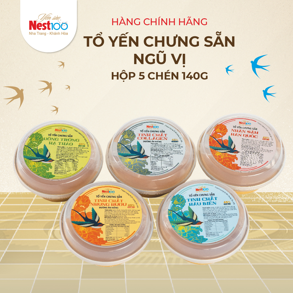 Tổ yến chưng sẵn ngũ vị – Sự kết hợp tinh túy giữa tổ yến sào thượng hạng và dược liệu quý từ thiên nhiên, cân bằng ngũ hành Kim - Mộc - Thủy - Hỏa - Thổ, mang đến nguồn dinh dưỡng trọn vẹn và năng lượng dồi dào cho cơ thể.