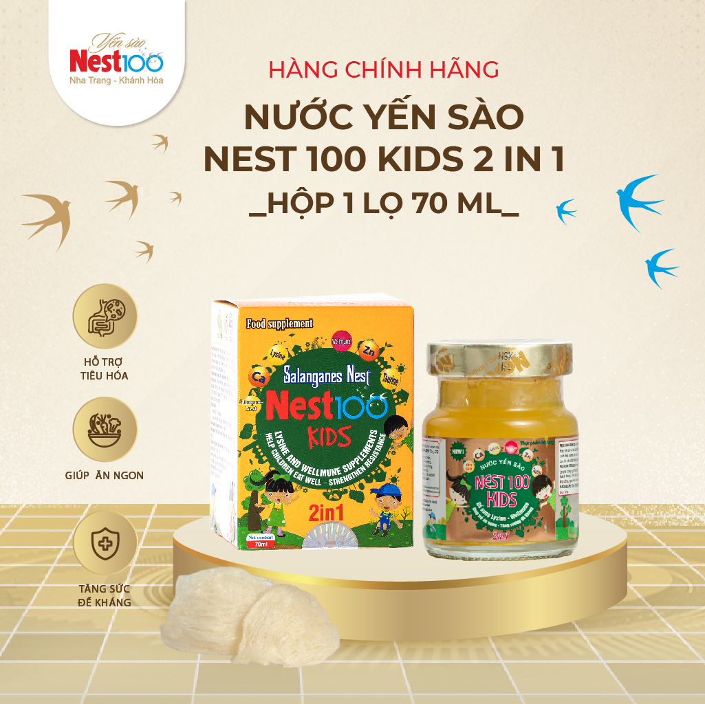 Nước Yến Sào Nest 100 Kids 2 in 1 nổi bật hơn hẳn với sự kết hợp giữa Yến Sào và hoạt chất Wellmune và Lysine, Vitamin C tăng cường hệ miễn dịch, bảo vệ sức khỏe tốt nhất cho trẻ nhỏ.